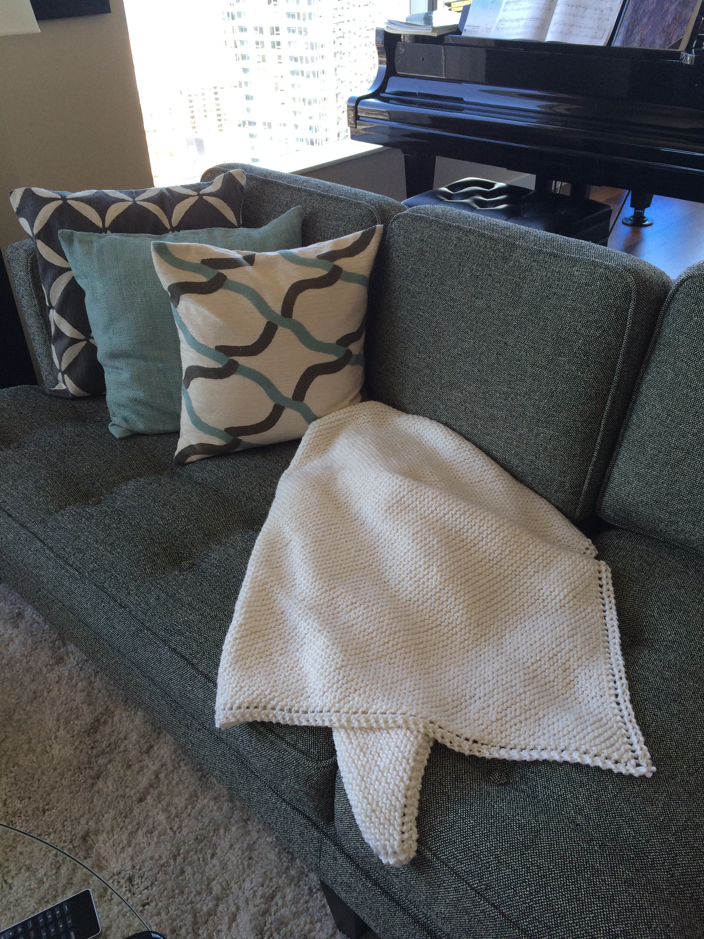 And so in just two weeks of only knitting on this project it is finished. The Perfect Summer Look of my house is complete. The red blanket is gone and the new white blanket is in place.