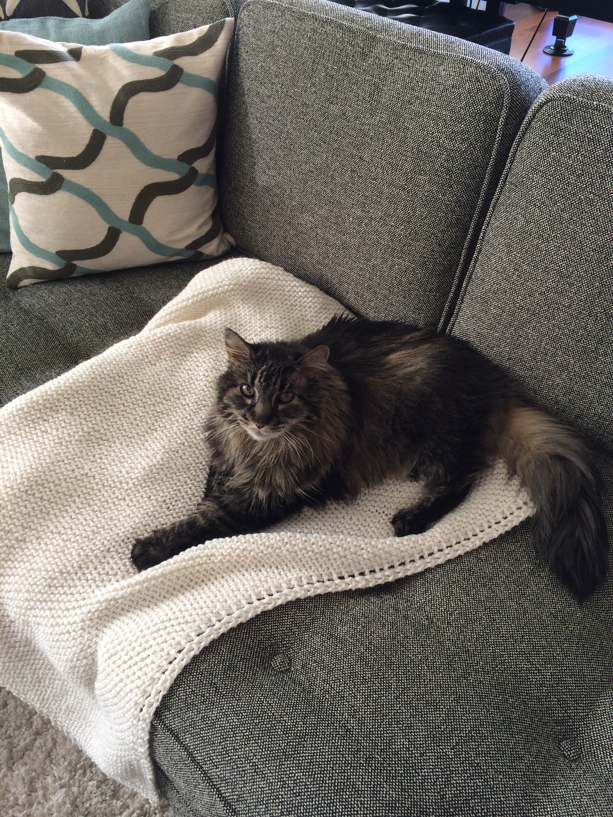 All is looking good except ….. the cat’s blanket on the sofa is the wrong color. Now Mozart is an old cat 23 years to be exact. A Maine Coon that has lived a long and spoiled life in our household. His “red” blanket was one I had knitted several years ago. It is his blanket and must be folded a certain way for him to rest comfortably on the sofa for HOURS and HOURS of rest.